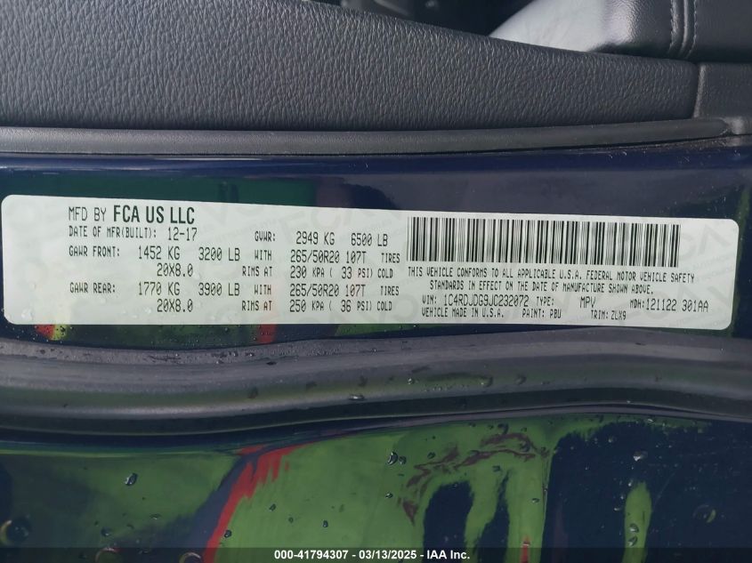 Color BlueCylinders 6Drive Full driveVIN 1C4RDJDG9JC******State Run & Drive VerifiedDamage Front or back AutoRIA