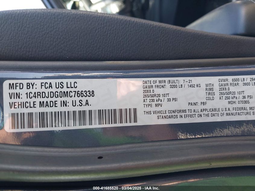 2021 DODGE DURANGO 2021 Gasoline, 3.6, Full drive, VIN - 1C4RDJDG0MC****** from the USA