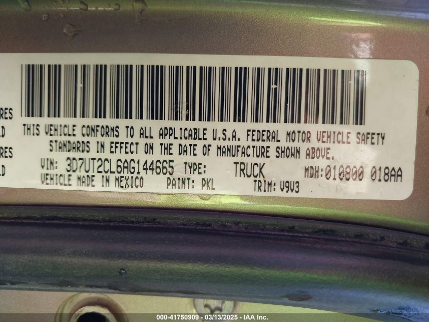 Color BrownCylinders 6Drive Full driveVIN 3D7UT2CL6AG******State Run & Drive VerifiedDamage Front or backAuction date 2025-03-24