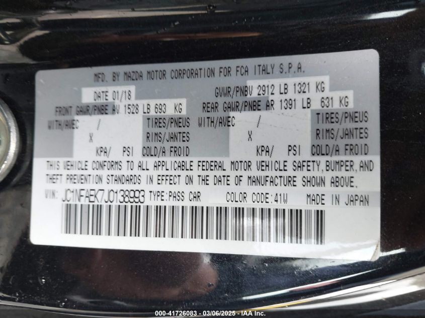 2018 FIAT 124 SPIDER 2018 Gasoline, 1.4, Rear wheel drive, VIN - JC1NFAEK7J0****** from the USA