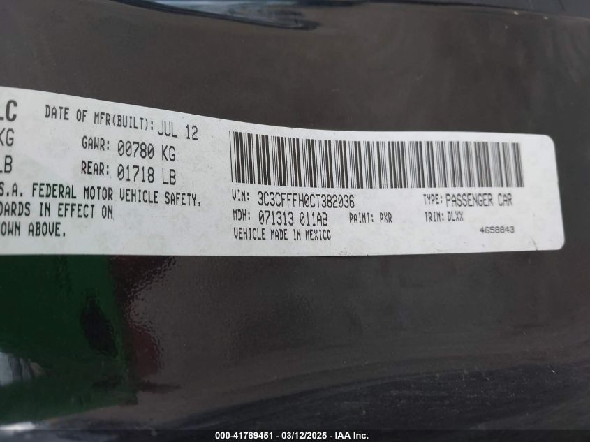 Color BlackCylinders 4Drive Front wheel driveVIN 3C3CFFFH0CT******State Run & Drive VerifiedDamage InsignificantAuction date 2025-03-20 AutoRIA