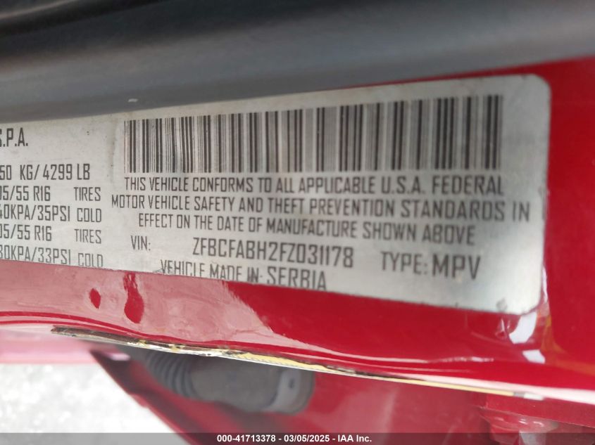 Color RedCylinders 4Drive Front wheel driveVIN ZFBCFABH2FZ******State Run & Drive VerifiedDamage InsignificantAuction date 2025-03-26 AutoRIA