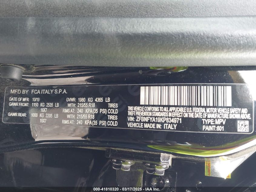 Color BlackCylinders 4Drive Full driveVIN ZFBNFYA19KP******State Run & Drive VerifiedDamage Front or back AutoRIA