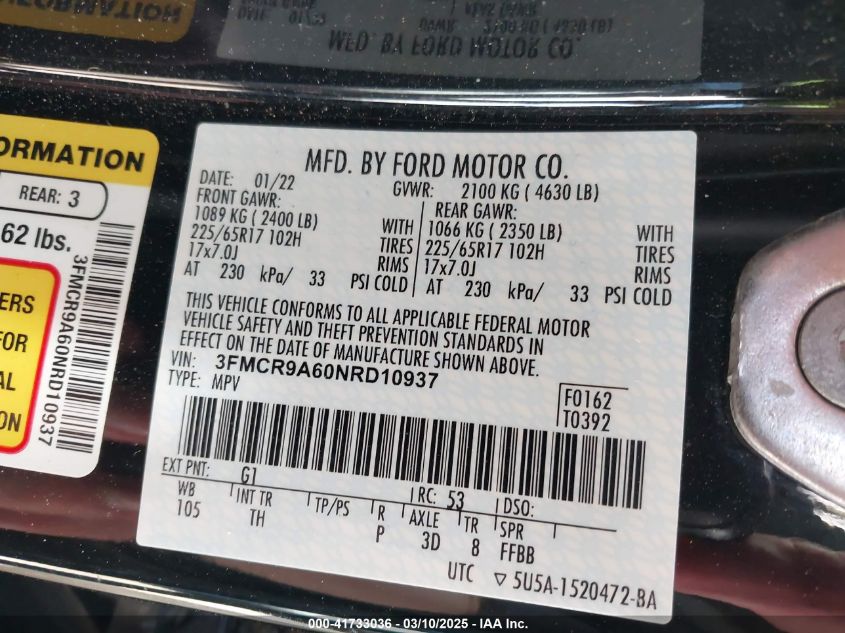 Color BlackCylinders 3Drive Full driveVIN 3FMCR9A60NR******State Run & Drive VerifiedDamage Front or back AutoRIA