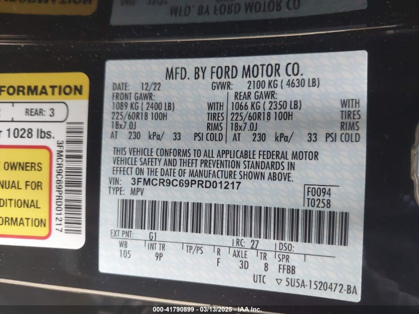 Color BlackCylinders 3Drive Full driveVIN 3FMCR9C69PR******State Run & Drive VerifiedDamage Rear left AutoRIA