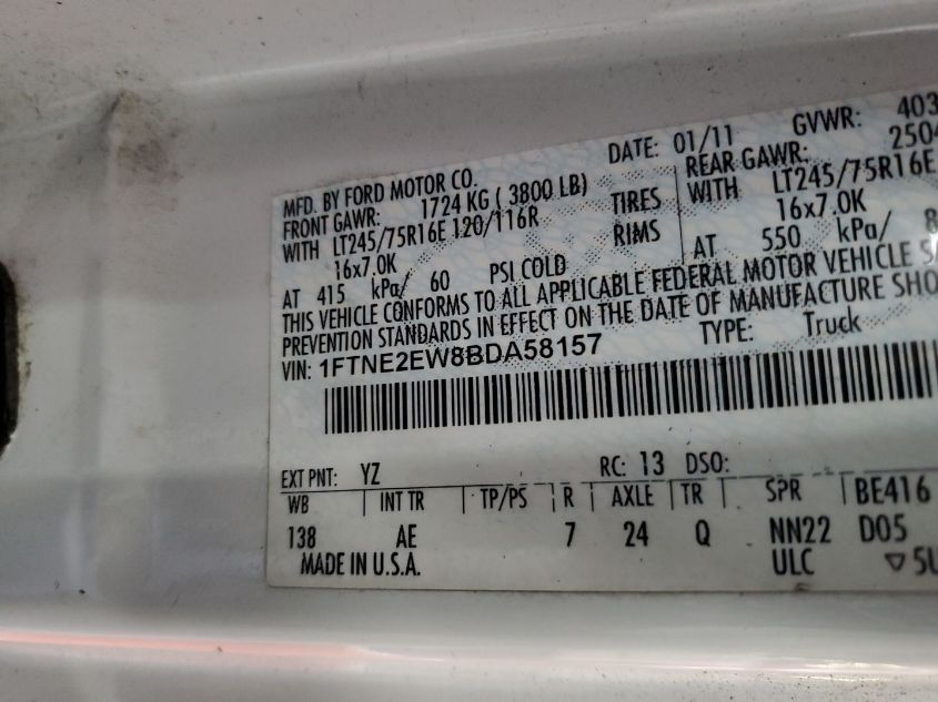 Color Cylinders 8Drive Rear wheel driveVIN 1FTNE2EW8BD******State Run & Drive VerifiedDamage Insignificant