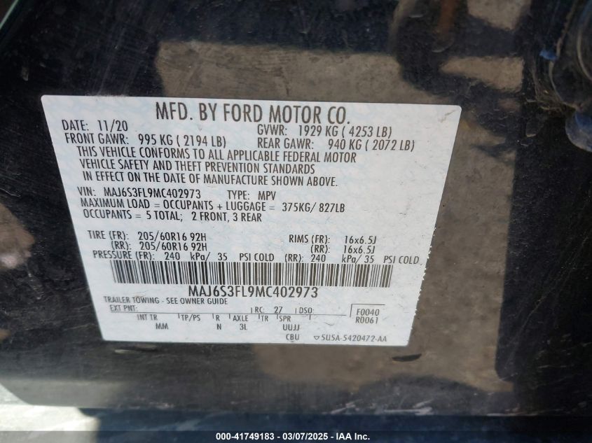 Color BlackCylinders 4Drive Full driveVIN MAJ6S3FL9MC******State Run & Drive VerifiedDamage It is unknown AutoRIA