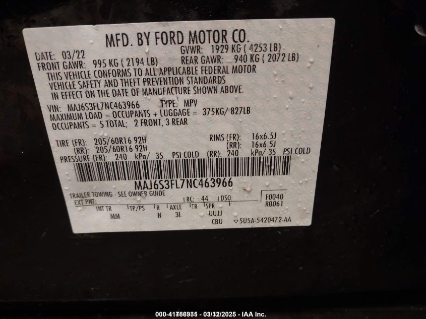Color BlackCylinders 4Drive Full driveVIN MAJ6S3FL7NC******State Run & Drive VerifiedDamage Front right AutoRIA