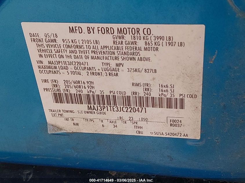 2018 FORD ECOSPORT 2018 Gasoline, 1.0, Front wheel drive, VIN - MAJ3P1TE3JC****** from the USA