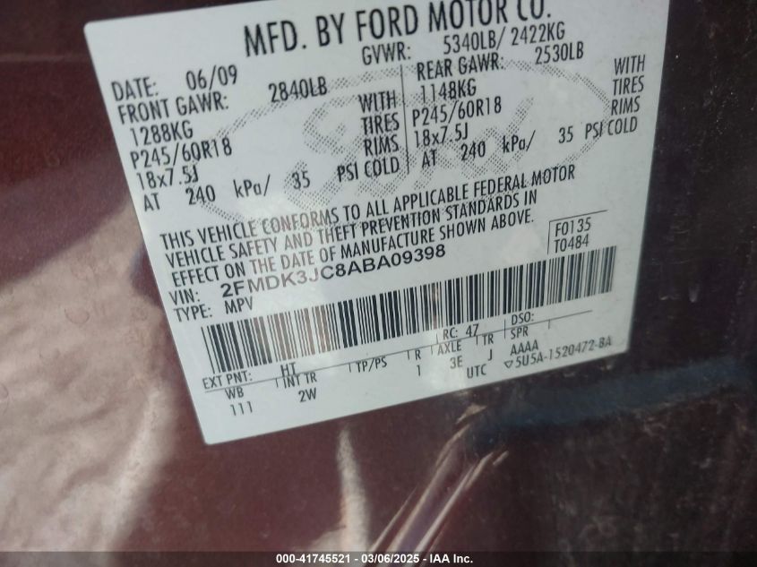 Color BurgundyCylinders 6Drive Front wheel driveVIN 2FMDK3JC8AB******State Run & Drive VerifiedDamage Insignificant