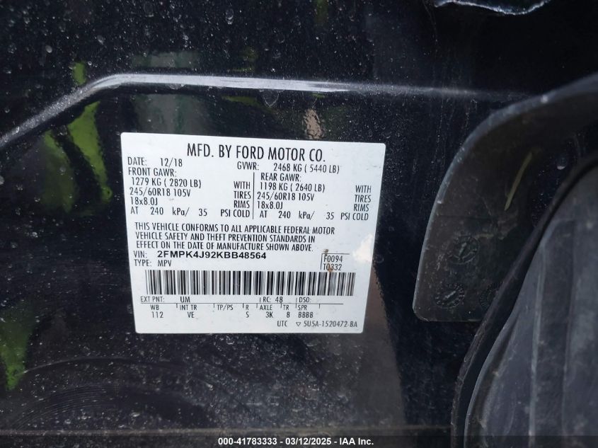 Color BlackCylinders 4Drive Full driveVIN 2FMPK4J92KB******State Run & Drive VerifiedDamage Right side AutoRIA