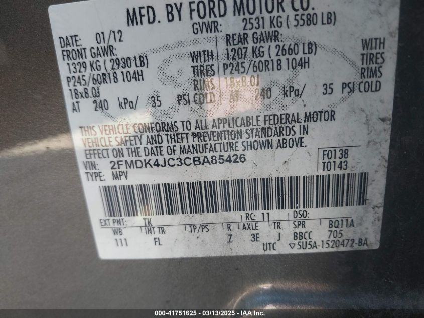 Color GrayCylinders 6Drive Full driveVIN 2FMDK4JC3CB******State Run & Drive VerifiedDamage Left side AutoRIA