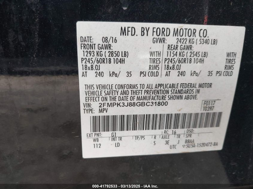 Color BlackCylinders 6Drive Front wheel driveVIN 2FMPK3J88GB******State Run & Drive VerifiedDamage Front or back AutoRIA