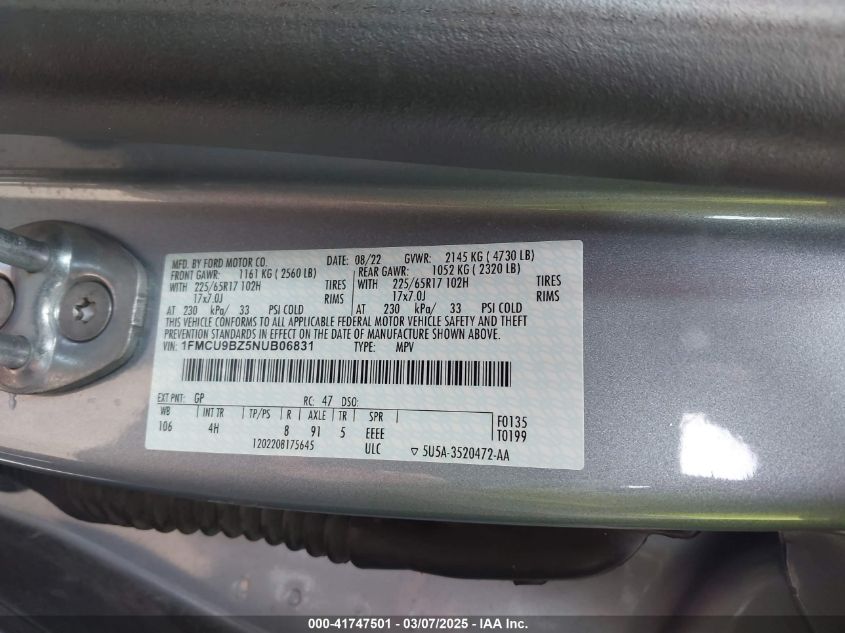 Color BlueCylinders 4Drive Full driveVIN 1FMCU9BZ5NU******State Run & Drive VerifiedDamage Front rightAuction date 2025-03-26 AutoRIA