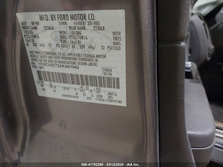 2010 FORD ESCAPE 2010 Gasoline, 2.5, Front wheel drive, VIN - 1FMCU0E72AK****** from the USA