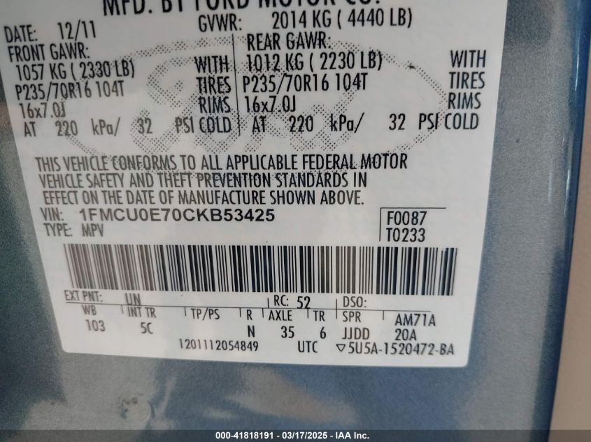 Color BlueCylinders 4Drive Front wheel driveVIN 1FMCU0E70CK******State Run & Drive VerifiedDamage Front right AutoRIA