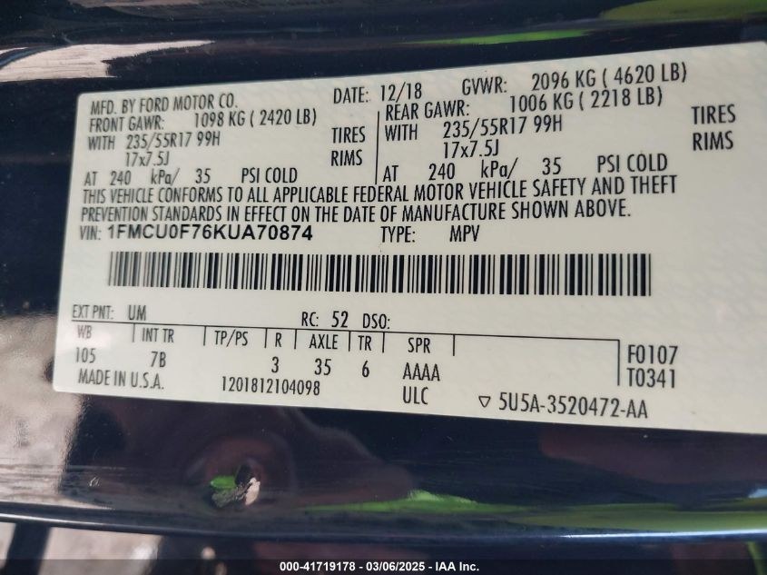 Color BlackCylinders 4Drive Front wheel driveVIN 1FMCU0F76KU******State Run & Drive VerifiedDamage Front or back AutoRIA