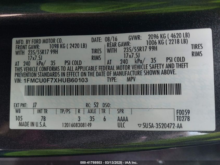 Color GrayCylinders 4Drive Front wheel driveVIN 1FMCU0F7XHU******State Run & Drive VerifiedDamage Front or back AutoRIA