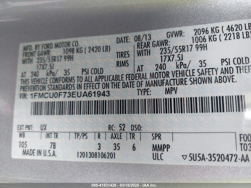 Color SilverCylinders 4Drive Front wheel driveVIN 1FMCU0F73EU******State Run & Drive VerifiedDamage Front or back AutoRIA