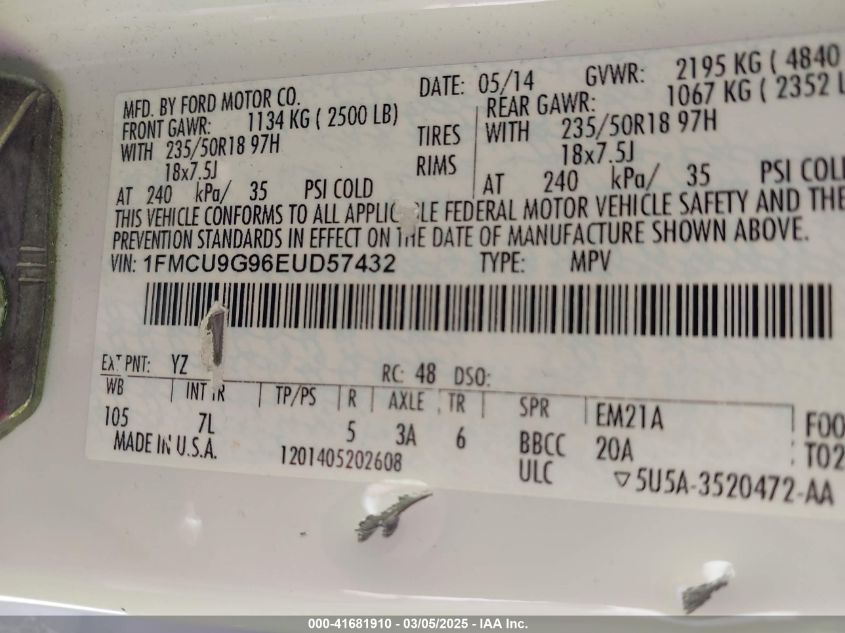 Color WhiteCylinders 4Drive Full driveVIN 1FMCU9G96EU******State Run & Drive VerifiedDamage Front or back AutoRIA