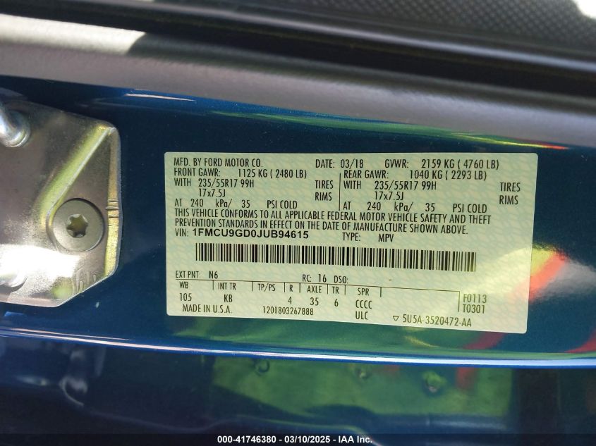 Color BlueCylinders 4Drive Full driveVIN 1FMCU9GD0JU******State Run & Drive VerifiedDamage Front or backAuction date 2025-03-25 AutoRIA
