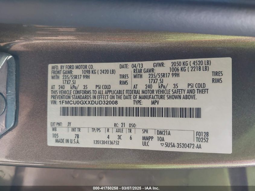 Color GreenCylinders 4Drive Front wheel driveVIN 1FMCU0GXXDU******State Run & Drive VerifiedDamage Front or back AutoRIA