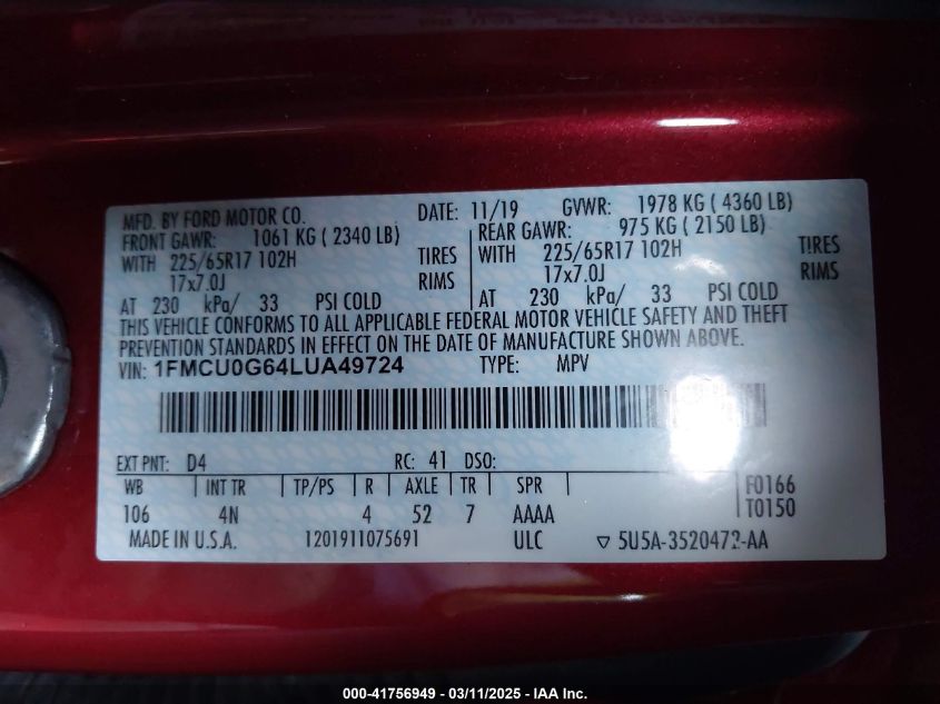Color RedCylinders 3Drive Front wheel driveVIN 1FMCU0G64LU******State Run & Drive VerifiedDamage Front or back AutoRIA