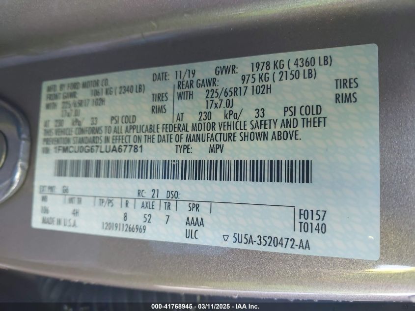2020 FORD ESCAPE 2020 Gasoline, 1.5, Front wheel drive, VIN - 1FMCU0G67LU****** from the USA