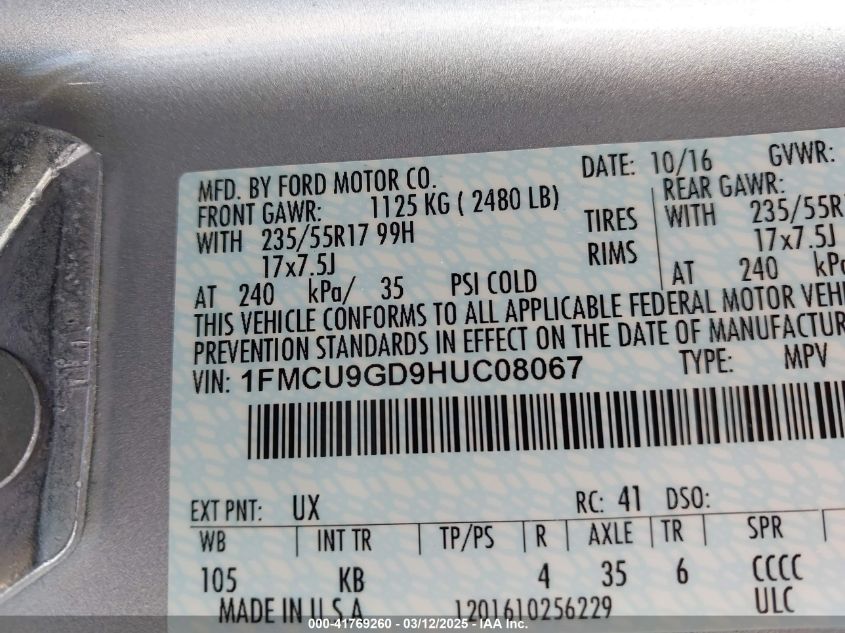 2017 FORD ESCAPE 2017 Gasoline, 1.5, Full drive, VIN - 1FMCU9GD9HU****** from the USA