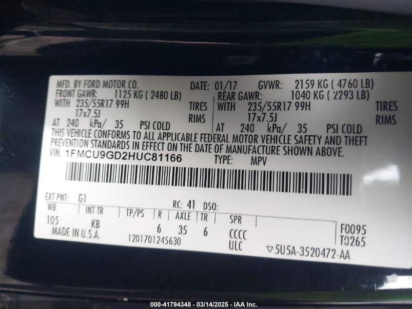 2017 FORD ESCAPE 2017 Gasoline, 1.5, Full drive, VIN - 1FMCU9GD2HU****** from the USA
