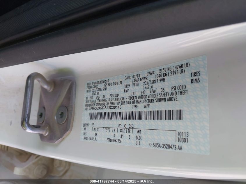 Color WhiteCylinders 4Drive Full driveVIN 1FMCU9GD2JU******State Run & Drive VerifiedDamage Front or back AutoRIA