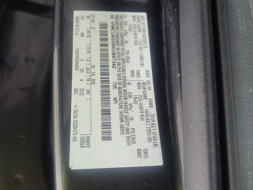 2019 FORD ESCAPE 2019 Gasoline, 1.5, Full drive, VIN - 1FMCU9GD8KU****** from the USA