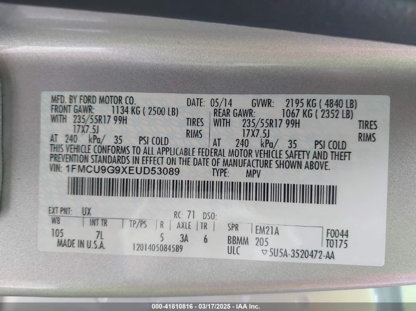 Color GrayCylinders 4Drive Full driveVIN 1FMCU9G9XEU******State Run & Drive VerifiedDamage Left side AutoRIA