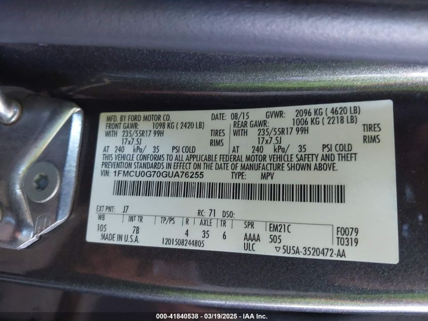 Color GrayCylinders 4Drive Front wheel driveVIN 1FMCU0G70GU******State Run & Drive VerifiedDamage Right side AutoRIA