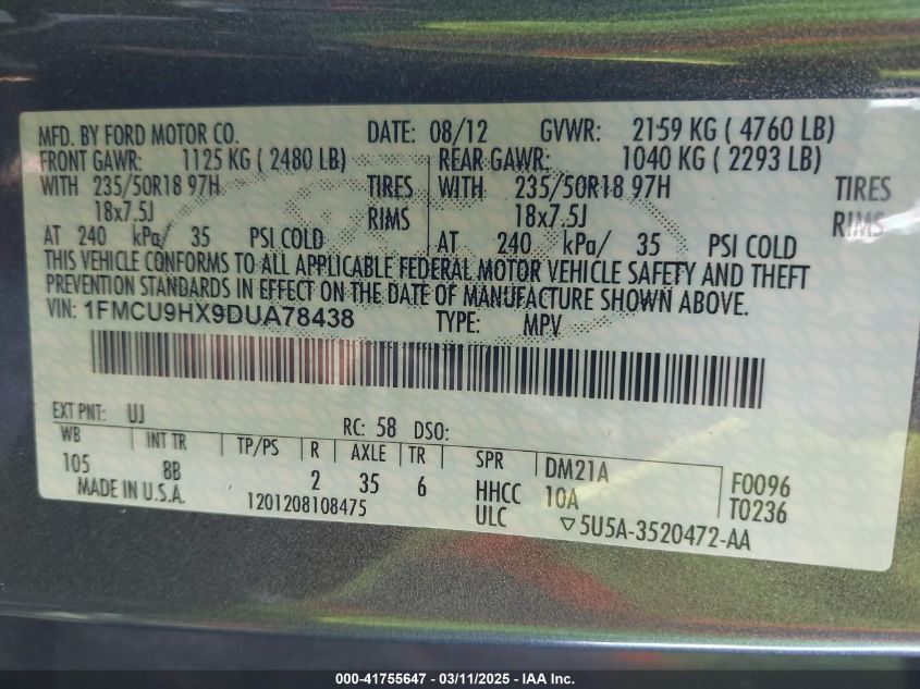 Color GrayCylinders 4Drive Full driveVIN 1FMCU9HX9DU******State Run & Drive VerifiedDamage Front or back AutoRIA