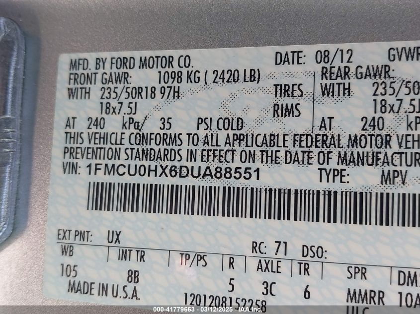 Color SilverCylinders 4Drive Front wheel driveVIN 1FMCU0HX6DU******State Run & Drive VerifiedDamage Front left AutoRIA