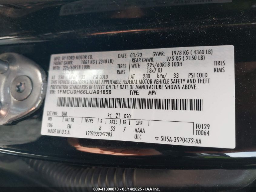 2020 FORD ESCAPE 2020 Gasoline, 1.5, Front wheel drive, VIN - 1FMCU0H66LU****** from the USA