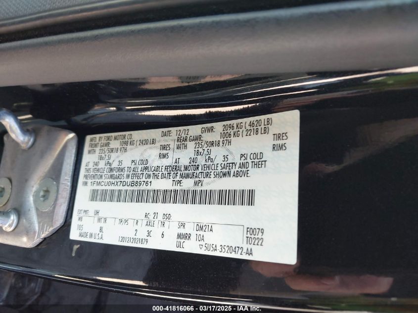 Color BlackCylinders 4Drive Front wheel driveVIN 1FMCU0HX7DU******State Run & Drive VerifiedDamage Back AutoRIA