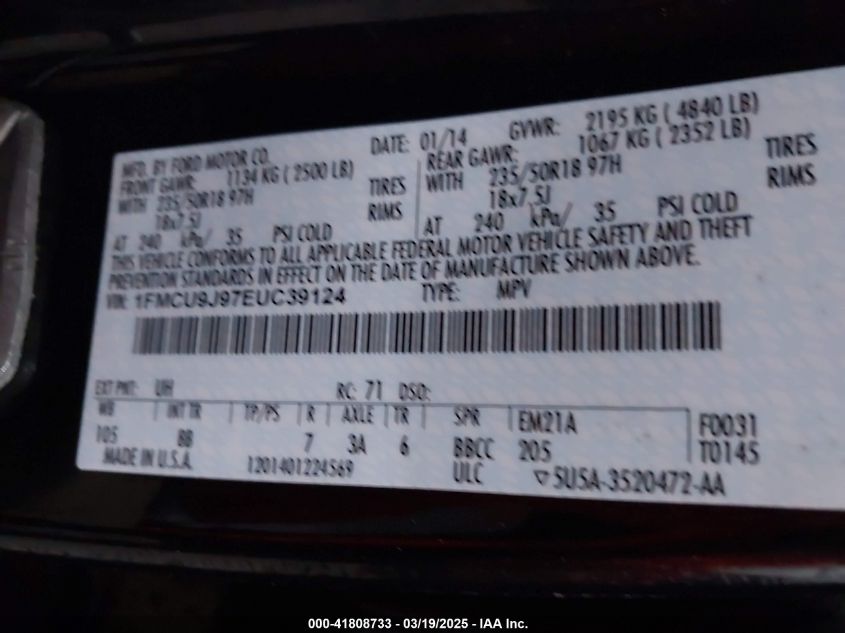 Color BlackCylinders 4Drive Full driveVIN 1FMCU9J97EU******State Run & Drive VerifiedDamage Front right AutoRIA