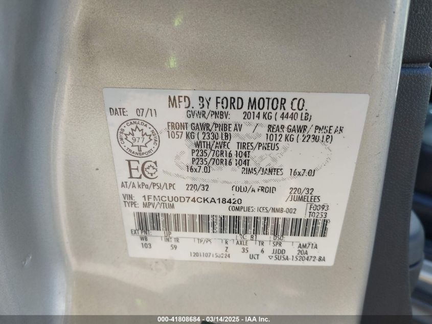 Color GoldCylinders 4Drive Front wheel driveVIN 1FMCU0D74CK******State Run & Drive VerifiedDamage Right sideAuction date 2025-03-20 AutoRIA