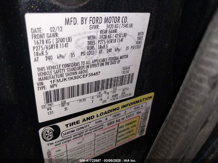 2012 FORD EXPEDITION 2012 Gasoline, 5.4, Unknown, VIN - 1FMJK1K50CE****** from the USA