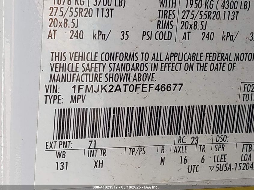 Color WhiteCylinders 6Drive Full driveVIN 1FMJK2AT0FE******State Run & Drive VerifiedDamage Front or back AutoRIA