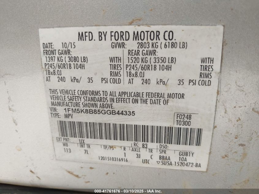 Color SilverCylinders 6Drive Full driveVIN 1FM5K8B85GG******State Run & Drive VerifiedDamage Front left AutoRIA