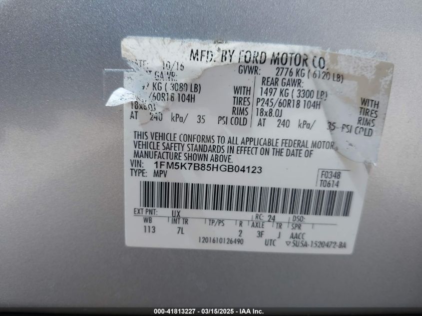 Color SilverCylinders 6Drive Front wheel driveVIN 1FM5K7B85HG******State Run & Drive VerifiedDamage Front or back AutoRIA