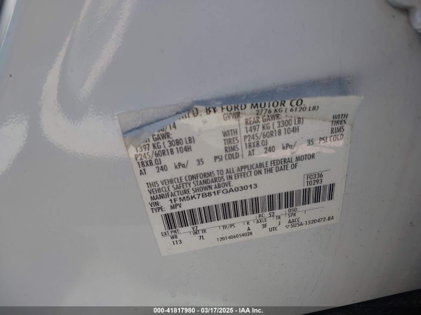 Color WhiteCylinders 6Drive Front wheel driveVIN 1FM5K7B81FG******State Run & Drive VerifiedDamage Front left AutoRIA