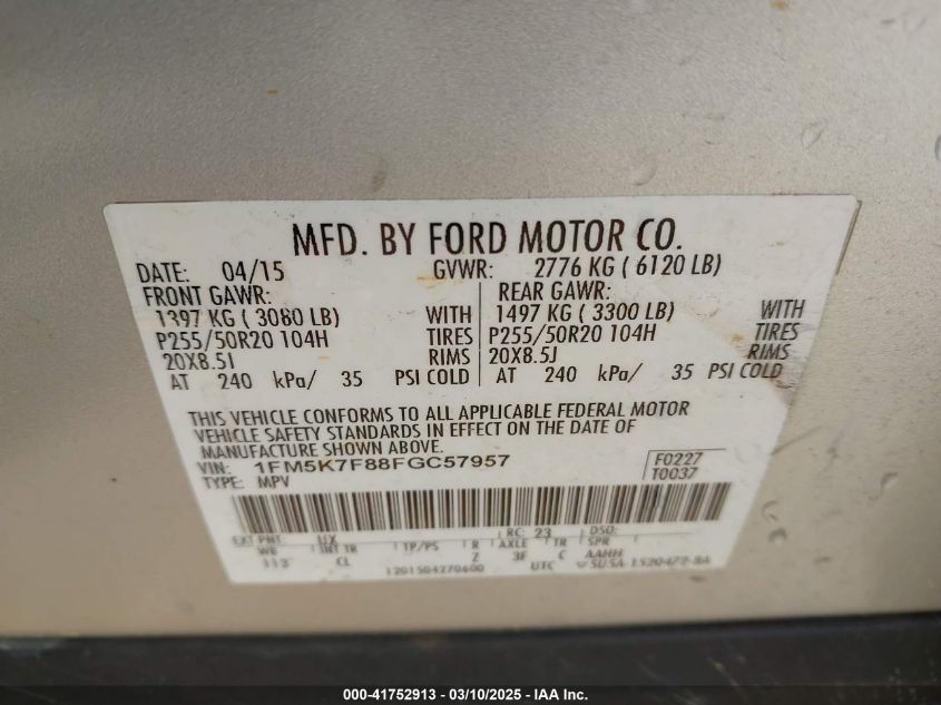 2015 FORD EXPLORER 2015 Gasoline, 3.5, Front wheel drive, VIN - 1FM5K7F88FG****** from the USA