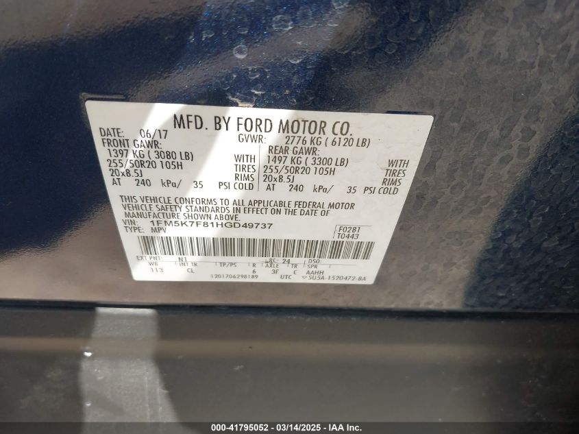 2017 FORD EXPLORER 2017 Gasoline, 3.5, Front wheel drive, VIN - 1FM5K7F81HG****** from the USA