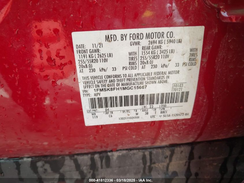 Color RedCylinders 4Drive Full driveVIN 1FMSK8FH1MG******State Run & Drive VerifiedDamage Front or back AutoRIA
