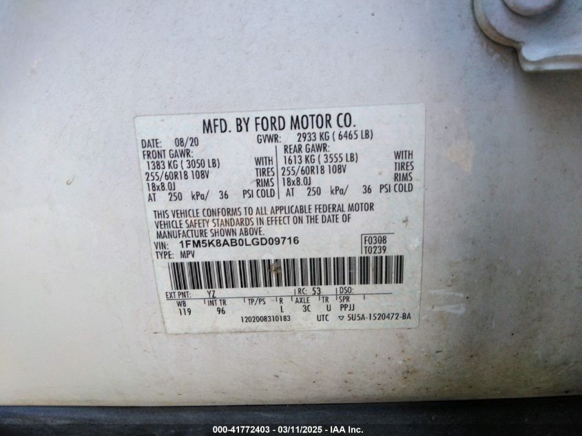 Color WhiteCylinders 6Drive Full driveVIN 1FM5K8AB0LG******State Run & Drive VerifiedDamage Front or backAuction date 2025-03-25