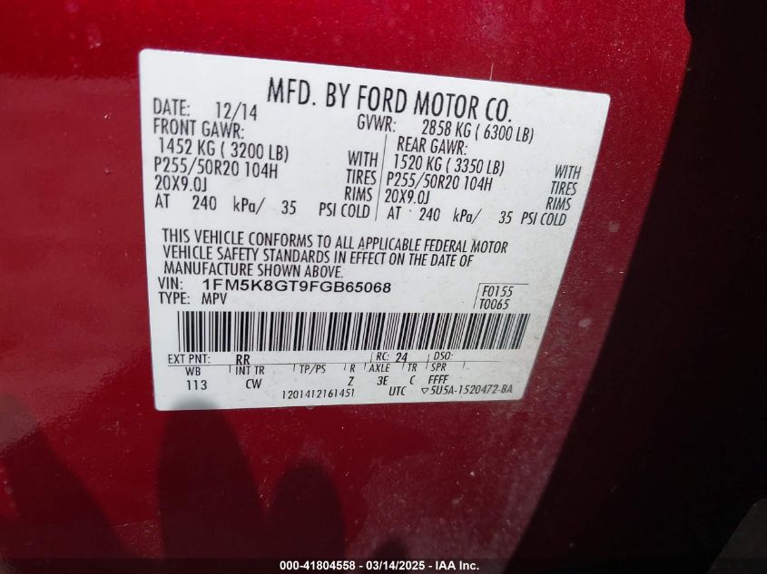 Color RedCylinders 6Drive Full driveVIN 1FM5K8GT9FG******State Run & Drive VerifiedDamage Water AutoRIA